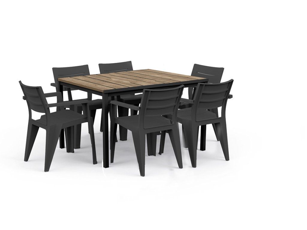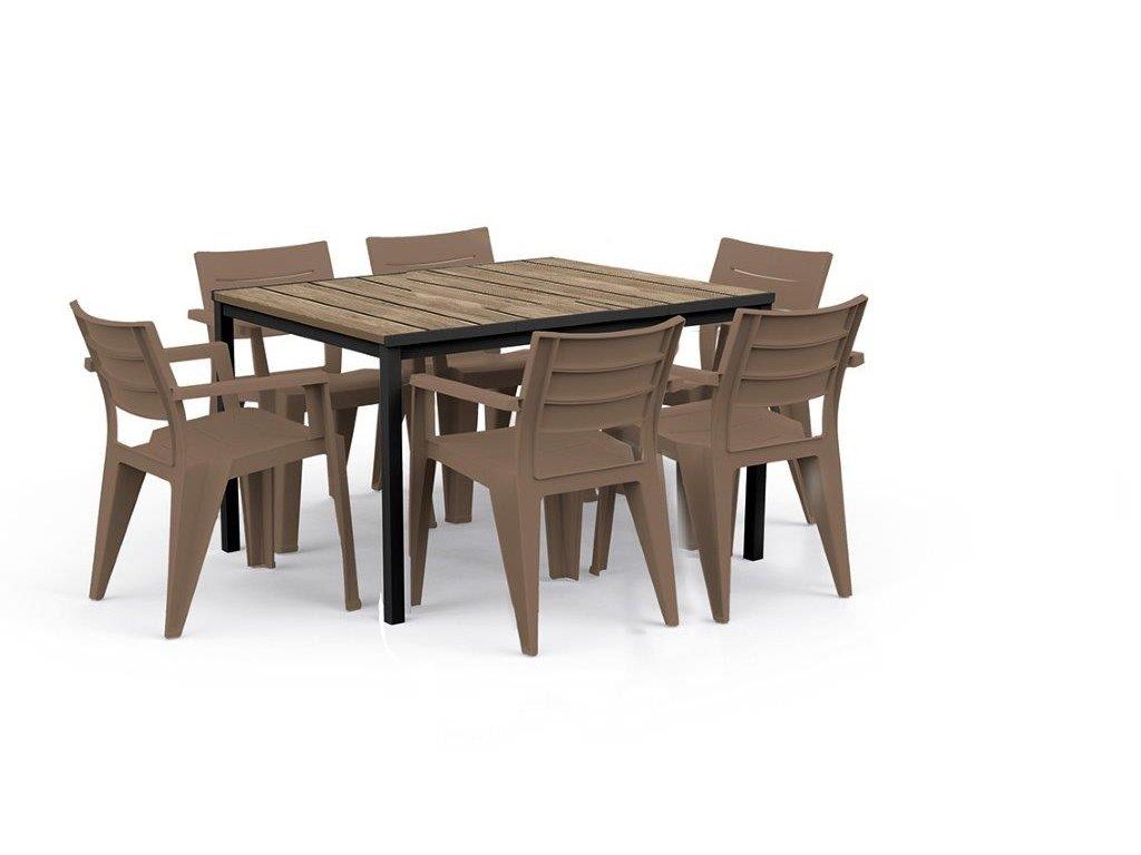 Díky unikátnímu povrchu DecoCoat odolá stůl nepříznivým povětrnostním vlivům a poškrábání. Zároveň si zachovává svou barvu. Textura navíc připomíná skutečné dřevo. Konstrukce je vyrobená z kovu, proto je stůl pevný a odolný.