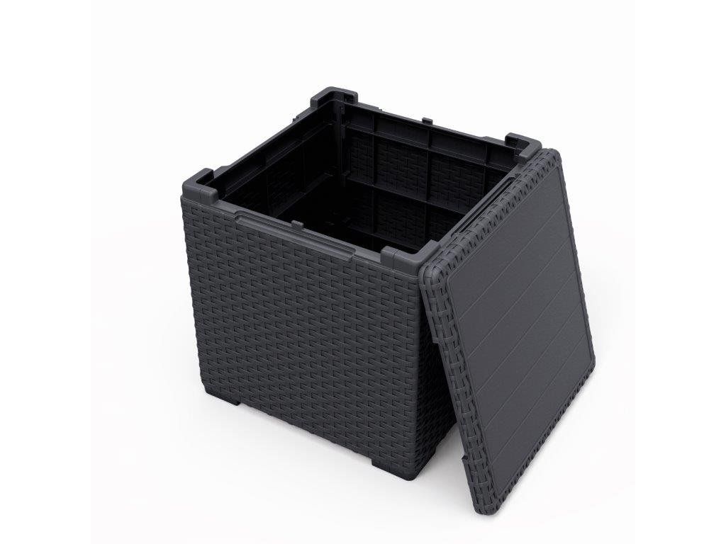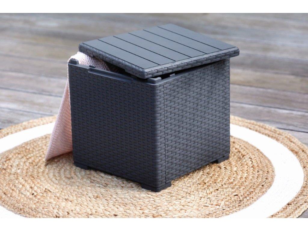 Uvnitř stolku se nachází úložný prostor, který využijete pro ukládání menších dek, podsedáků, náčiní a dalších drobností. Stačí otevřít jeho víko. Po uzavření boxu si na něj odložíte své pití či zákusek. Stolek je vybavený 4 úchyty, které vám usnadní jeho přemisťování.