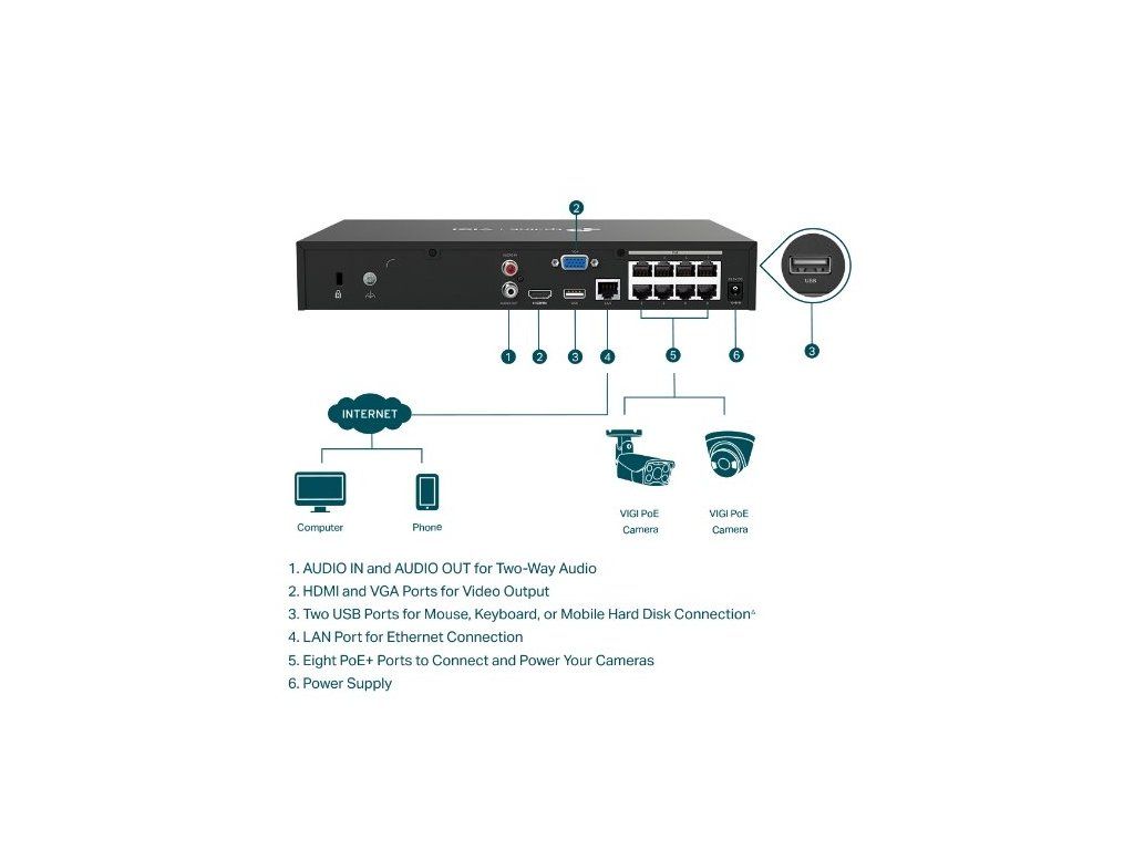 Zařízení TP-Link VIGI NVR1008H-8P s 4K HDMI video výstupem zaznamenává videa z bezpečnostních kamer a usnadňuje jejich správu. Poskytne vám vysoké rozlišení obrazu až 8MP. Ohlídáte si dění na svém pozemku či ve svém podniku (prodejna, sklad, restaurace, penzion). Zobrazíte si záběry až z 8 kamer najednou. Neuteče vám tedy žádný detail. Díky kompresi H.265+ je video křišťálově čisté. Aniž by došlo ke ztrátě kvality, nezabere tolik místa na vašem disku. S jeho pomocí uložíte až 10 TB záznamu z připojených kamer. Aplikace VIGI vám umožní vzdálené monitorování.
